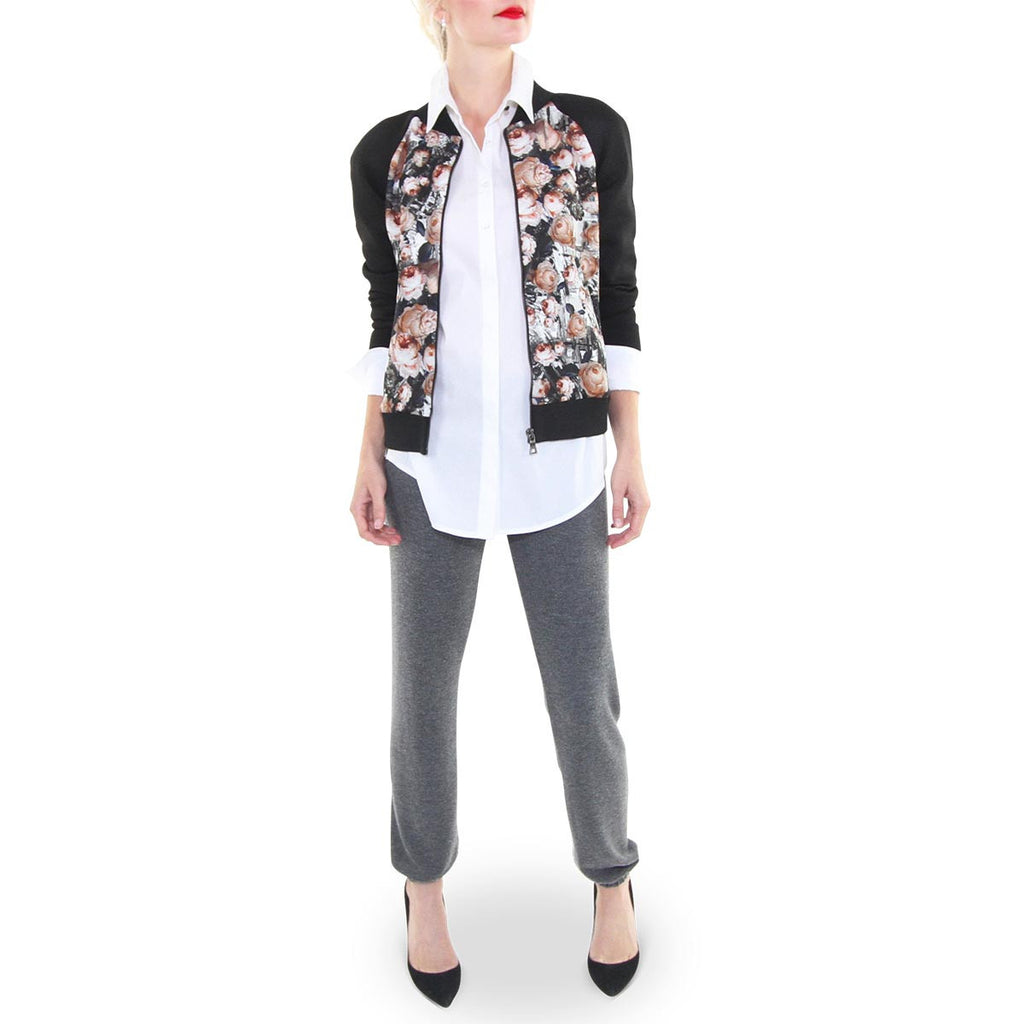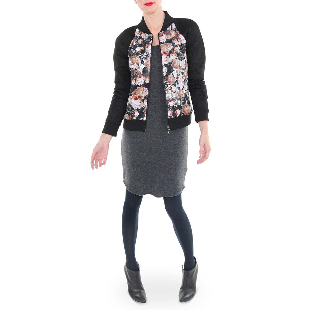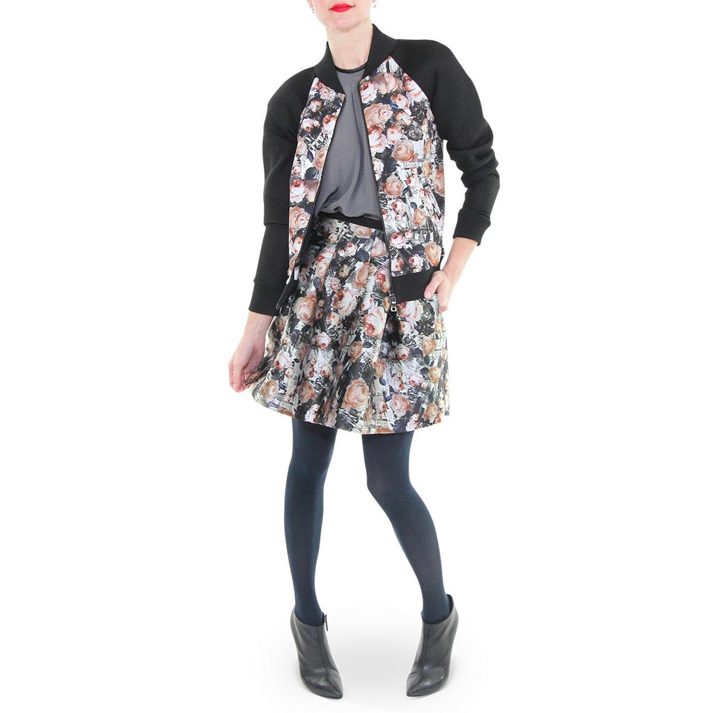 The lovely floral paired with a sporty bomber silhouette is the perfect blend adding versatility to this special Sachin and Babi jacket. Style yours over your go-to black track pants and loafers for an effortlessly chic look during daytime errands or fundraising meetings at school. Planning a night out on the town, dress it up with the matching print on print circle skirt.